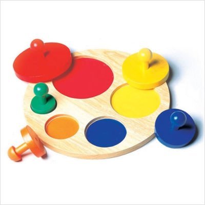 18 months & up. Pick a strategy for matching...colors or sizes! 5 circles in 5 sizes and colors fit easily into matching color-inlaid wells. Jumbo knobs make pieces easy to grip and manipulate.