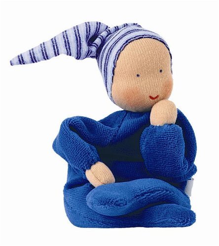 Our cuddly Waldorf doll is fully washable. Dressed in a one piece velour jumper and colorful hat, these dolls are the perfect size for small hands to grasp and hold. Measures 8" in length. Imported from the Kathe Kruse Company of Germany. Ages 6 month and up.