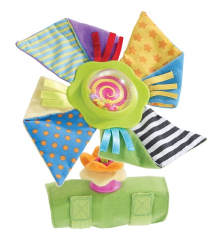 A gentle touch will send this vibrant stroller-attached toy spinning around and around what fun! In addition to visual stimulation babies enjoy, the rattling beads in the center and crinkly petals provide exciting sounds, too. Hours of fun while strolling along.
