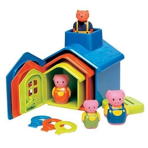 3 nesting houses, 3 color coded keys to lock doors which store in chimney, 3 little pigs and 1 big bad wolf (who fits down the chimney). Classic story play!
