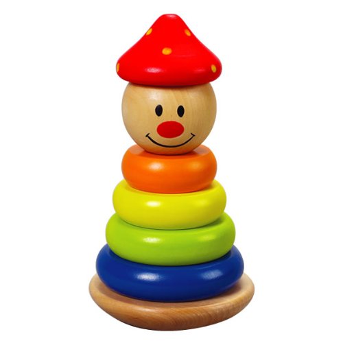 Friendly clown with hat and stacking rings on a natural wood swivel base.3.5" x 3.5" x 6.4". Ages 1 year and up.