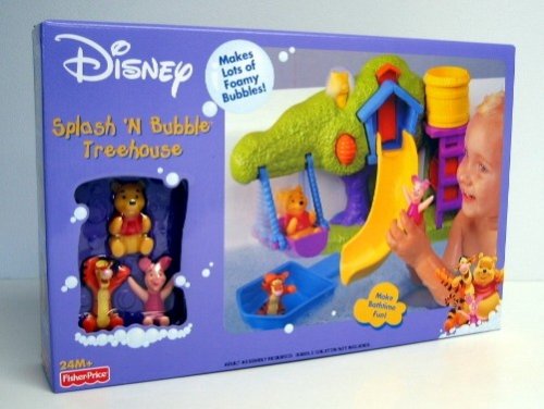 Have hours of fun in the tub with Winnie the Pooh and his friends Tigger and Piglet! Pooh and his friends love to slide, swing and splash in the water. A tree house grows in the bathtub. This activity set easily attaches to the side of the tub with suction cups, and comes with lots of entertaining functions - a water wheel you activate by pouring water into a barrel above it, a chimney that puffs out "smoke" bubbles made from shampoo or soap, a swing for Pooh and his friends Piglet and Tigger, a boat, and a slide you can send Pooh and company down.