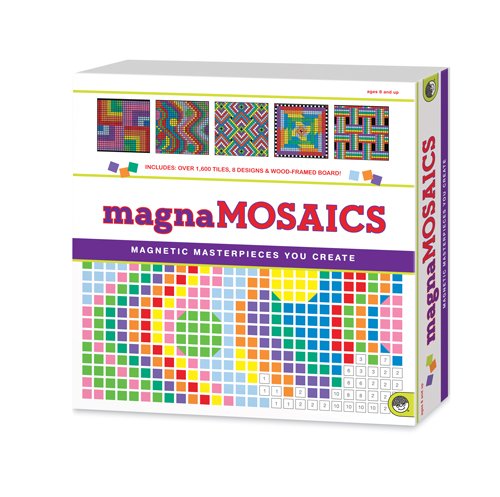 Visual perceptions, dexterity and creative thinking skills take shape with MagnaMosaics. Transparent pattern sheets are included to help you replicate detailed mosaic patterns, or skip the pattern sheet and go freestyle fro unrestricted creativity. Then display your finished masterpiece within the wood-framed art board and easel-until you're ready to do it all over again. Includes over 1,600 magnet tiles in 12 different colors and 8 acetate template sheets.