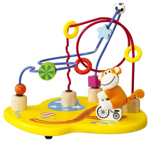 18 months and up. Little circus monkey can ride a bike or hang from this circus themed roller coaster with his magnetic tail. Weave rings and beads on two different color wires for added circus fun.
