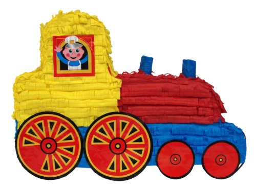 Train Pinata is 20" long. Features 2 chimneys, wheels and window with train driver.