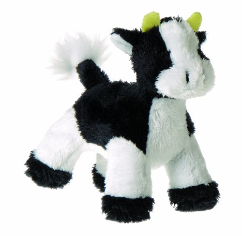 She moos when you press her side and features a removable "press me" sticker to get you started. This 4.5" tall cow is black and white with yellow fabric horns, black embroidered nose, and shiny black eyes.