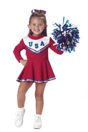 H-A-L-L-O-W-E-E-N! This colorful cheerleader costume for toddler girls consists of a one-piece red dress with red, white and blue detailing, blue glitter "USA" lettering and one pom-pom! Other accessories available separately. Cheerleader costume for toddler girls available in Toddler Size 3-4.